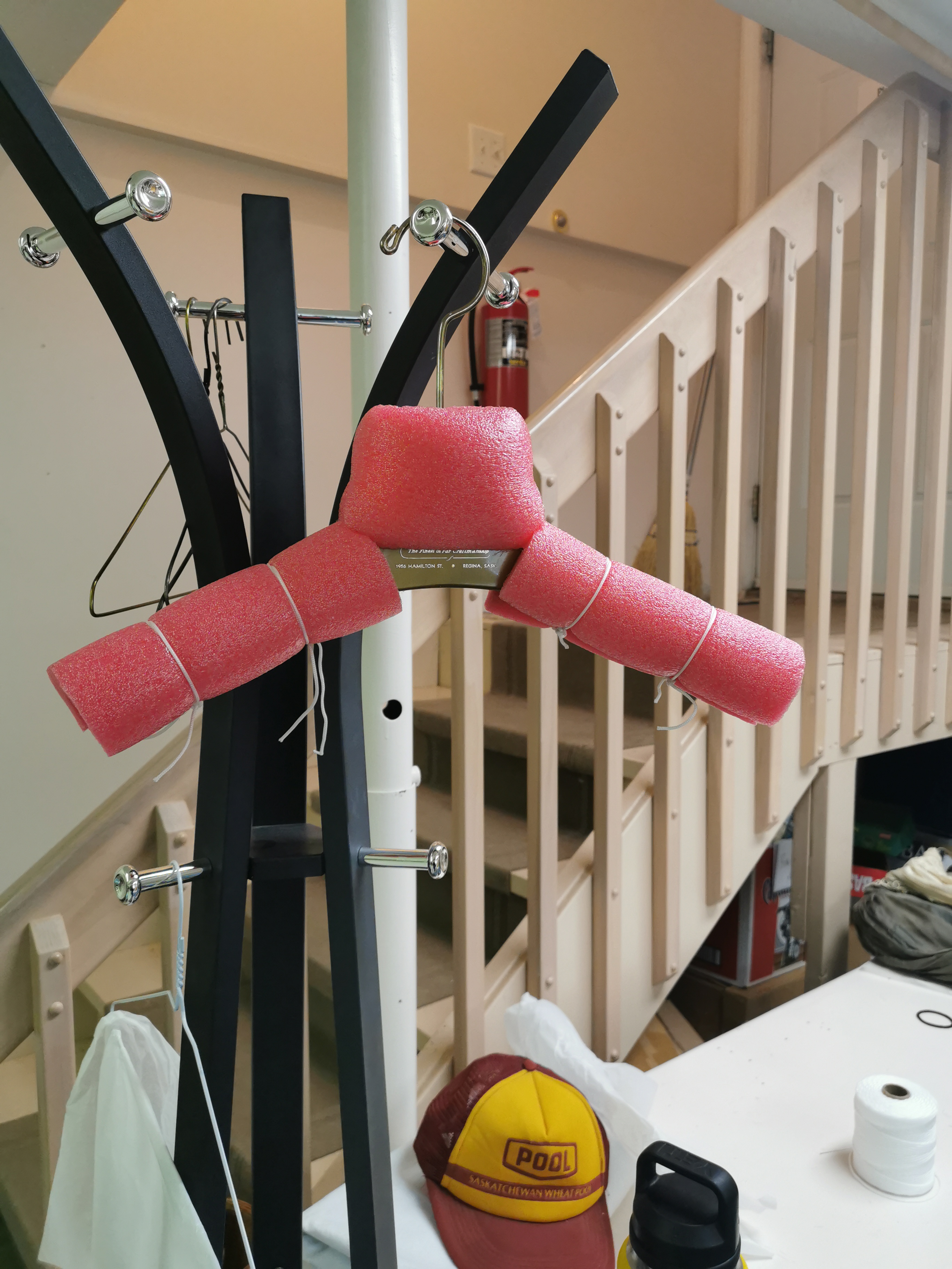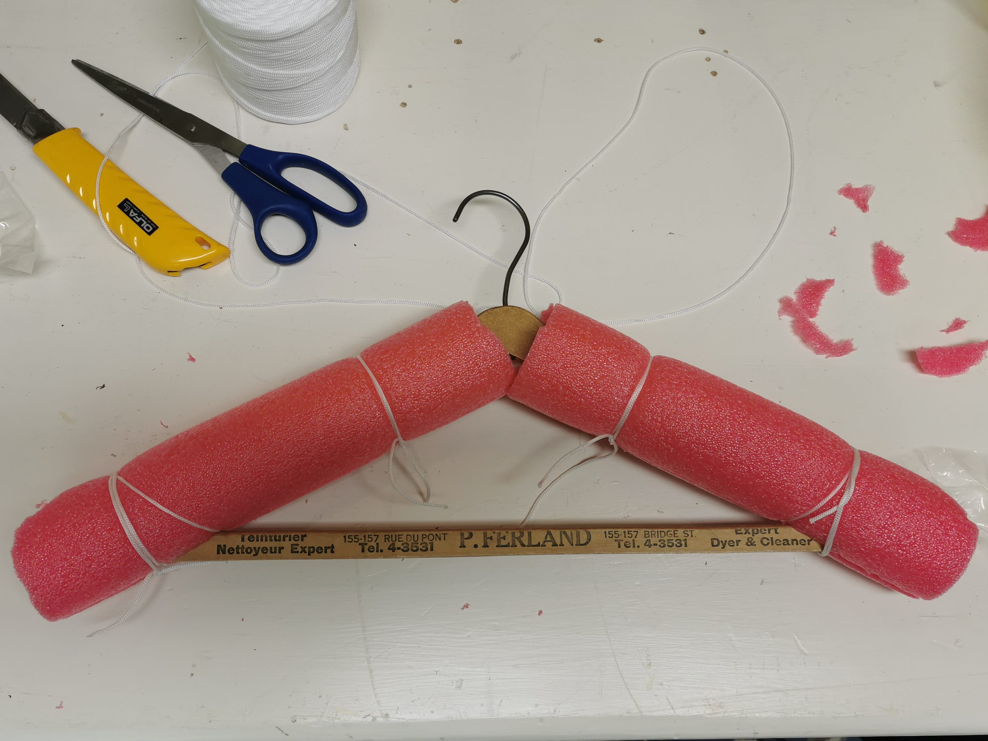 To create my hangers, I used hangers that we already had in the museum (wooden and plastic ones) and added on to them to create support for the garment. I did this using pool noodles, string, and where I needed to, hot glue. It certainly sounds like an odd bunch of objects to use for artifact preservation, but they do the job! You can see in the image above how I added pool noodles to each side and secured them with string – I prefer using string for these kinds of hangers instead of hot glue as it makes it easier to reposition things if needed. As well, for some of these hangers I also tried to shape the ends a little by ‘sculpting’ the foam with an exacto knife to match some garments a bit better.