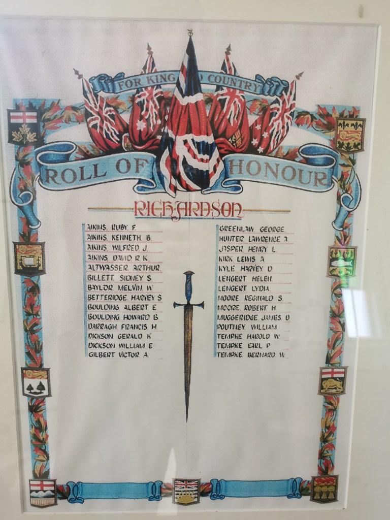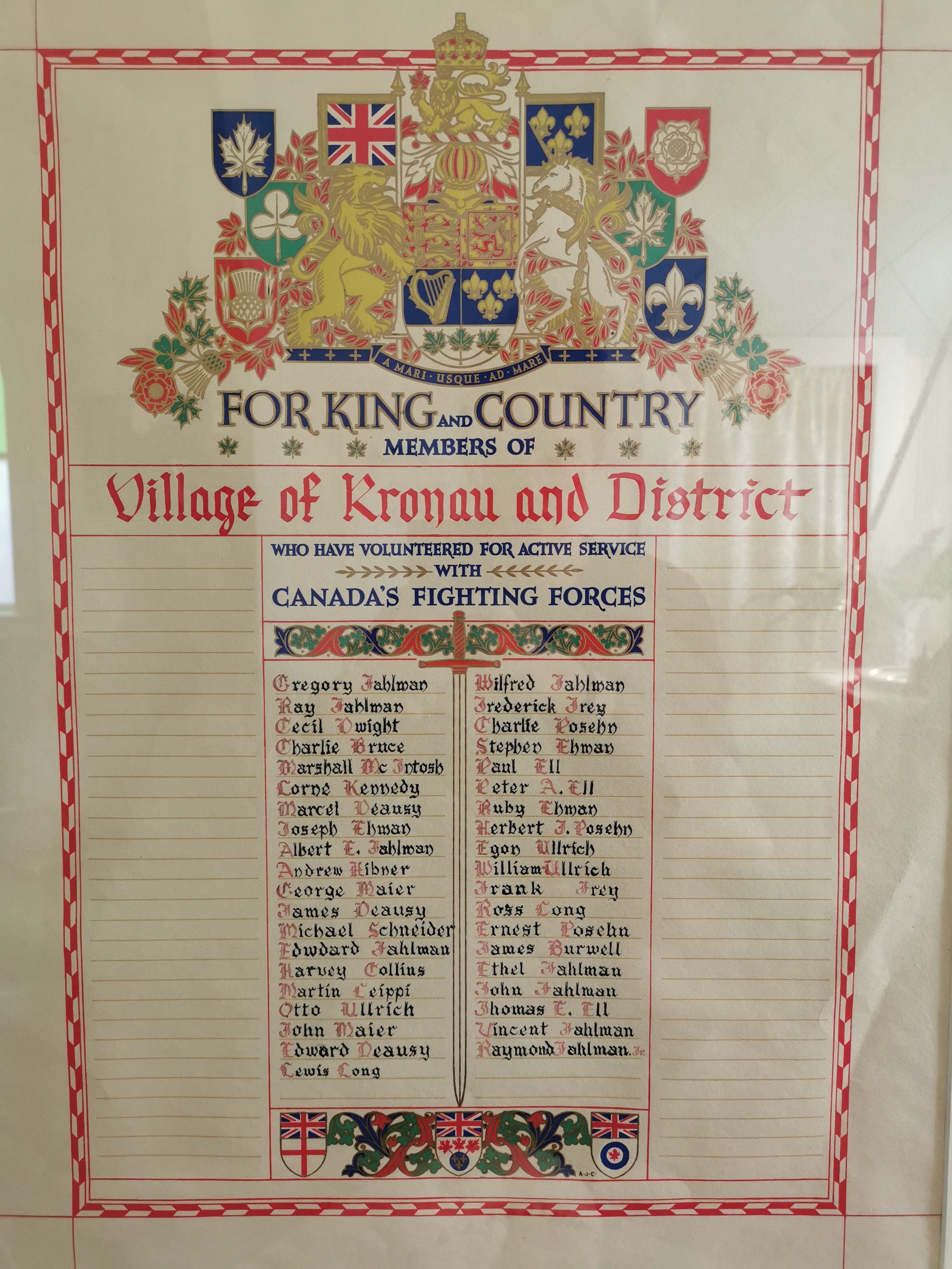 However, the First World War touched Kronau and the surrounding area as well. In our church building you can find the original copy of the Kronau Roll of Honour framed at the front of the church. We also have a copy of the Roll of Honour for Richardson on display. The Roll of Honour was a way to commemorate those who fought in the First World War and were made by communities, schools, and businesses to honour those who served. The Kronau Roll of Honour on display shows the names of the 39 men from Kronau who served during the war. Both Honour Rolls in our collection can be viewed above.