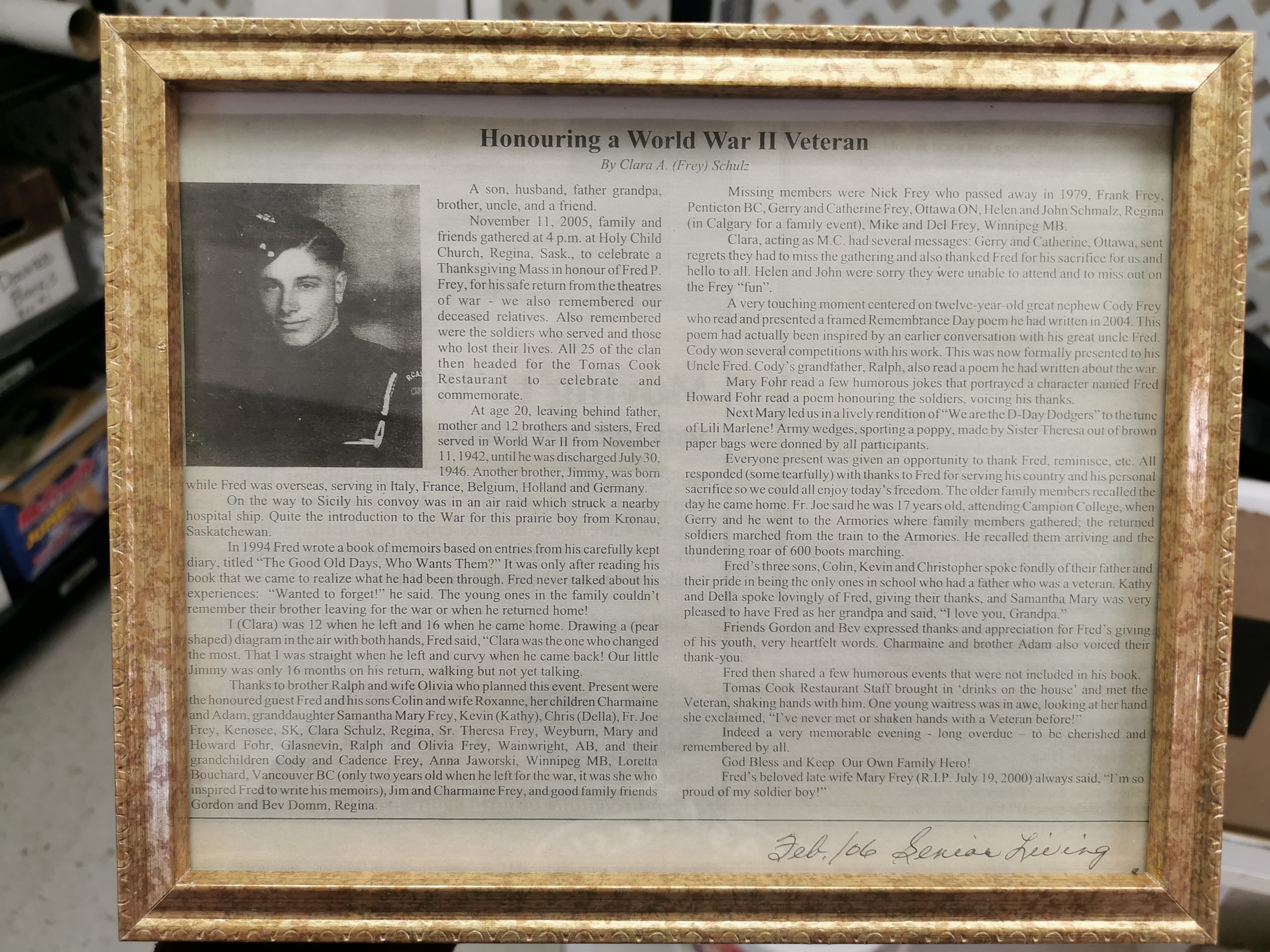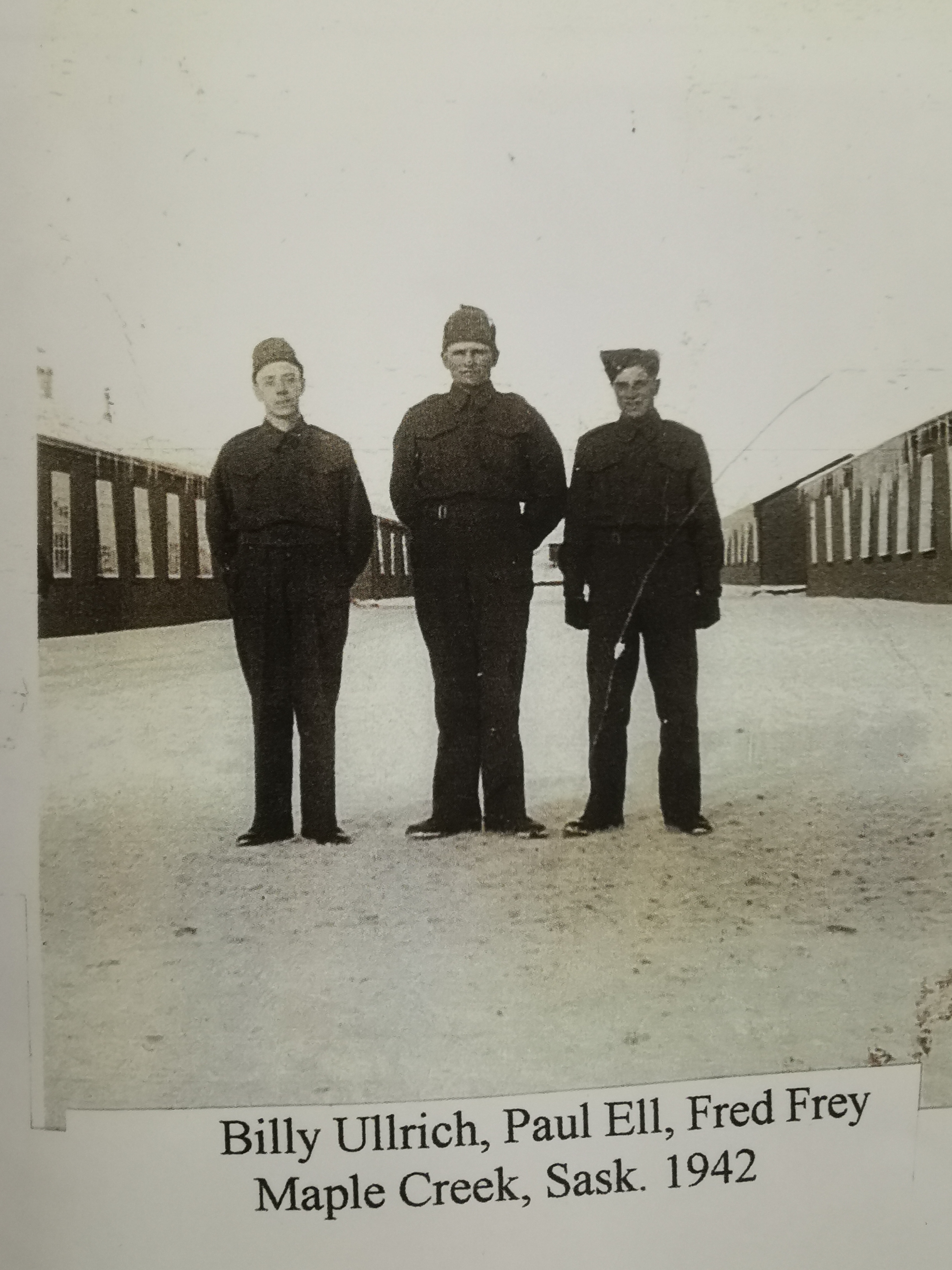 Fred Frey was called to report for army service in November of 1942 and completed his basic training in Maple Creek, Saskatchewan. After which he went to Red Deer, Alberta for further training before being sent over to England in 1943 for even more training and deployment to Italy. He detailed some of his experience in a family history book donated to the museum collection. My favourite line comes from a description of his work in Italy: “We [were] hauling supplies, gas and ammunition. Some very scary trips for a lad coming off the flat prairie, who had never seen mountains before, to drive a three ton truck at night without lights, hairpin turns and getting strafed by Jerry planes and also had to contend with land mines” (pg. 46). How crazy it must have been to go from flat fields to huge mountains!