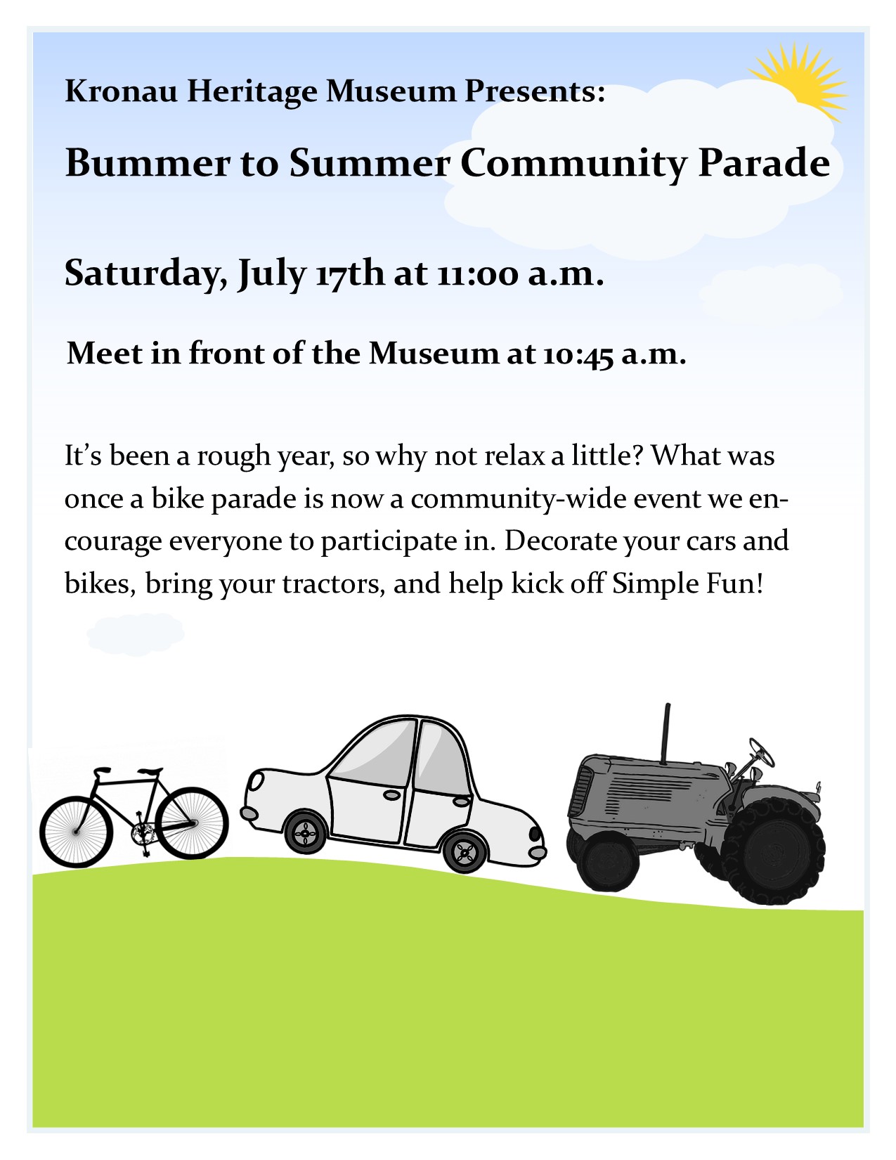 To kick off our the Simple Fun festivities, we have our “New and Improved” parade! We hope everyone will join us for our Bummer to Summer Parade, starting at 11:00am. Please meet in front of the museum by 10:45 to keep us on schedule!