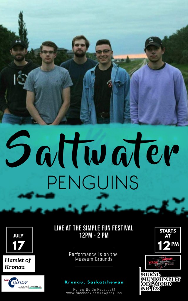 This year’s entertainment will be provided by the Saltwater Penguins, a local Regina group! They cover songs from the the 70’s, 80’s, and 90’s. With a special surprise guest, they will be performing from 12pm-2pm during Simple Fun!