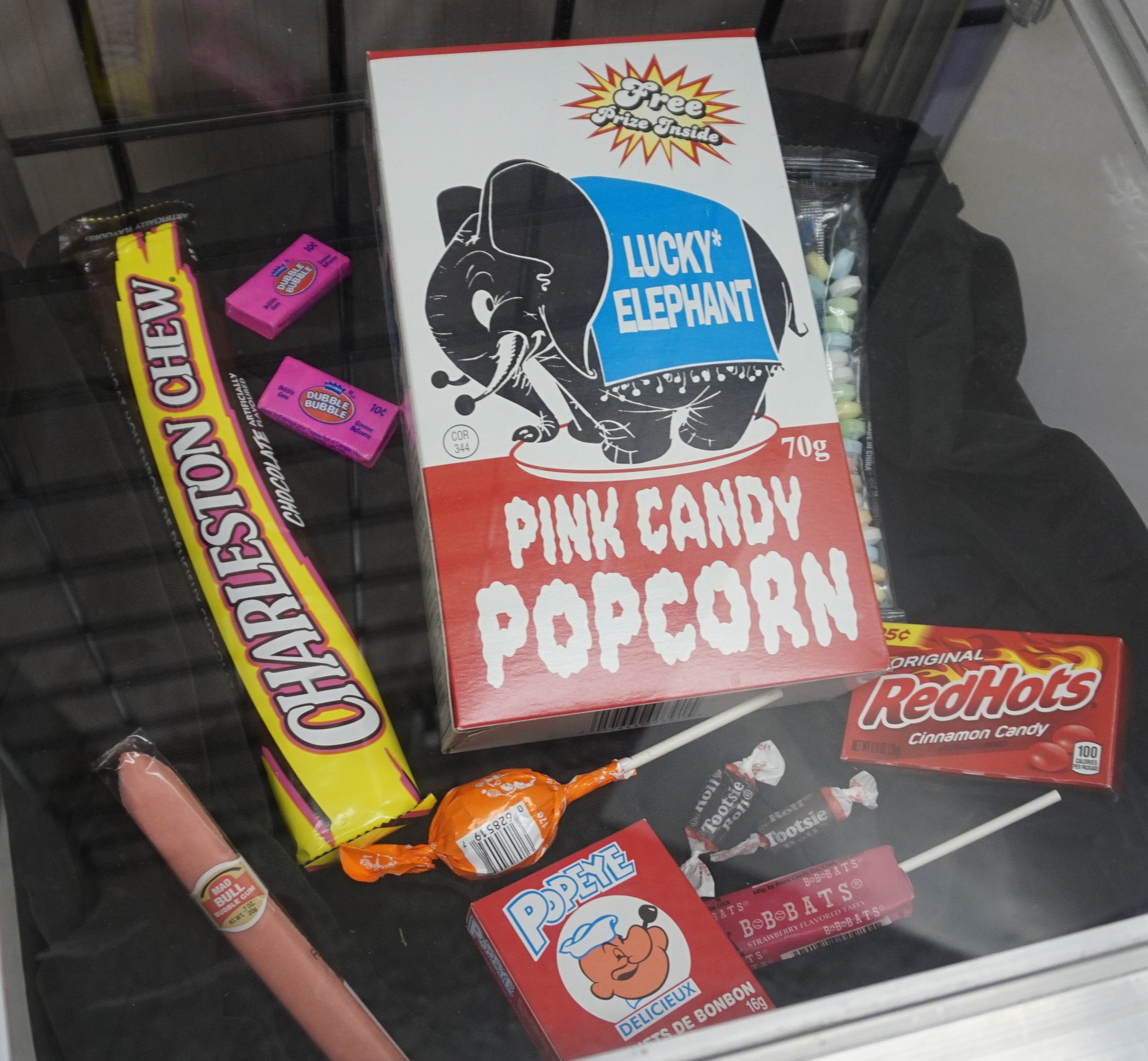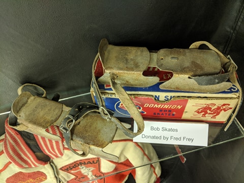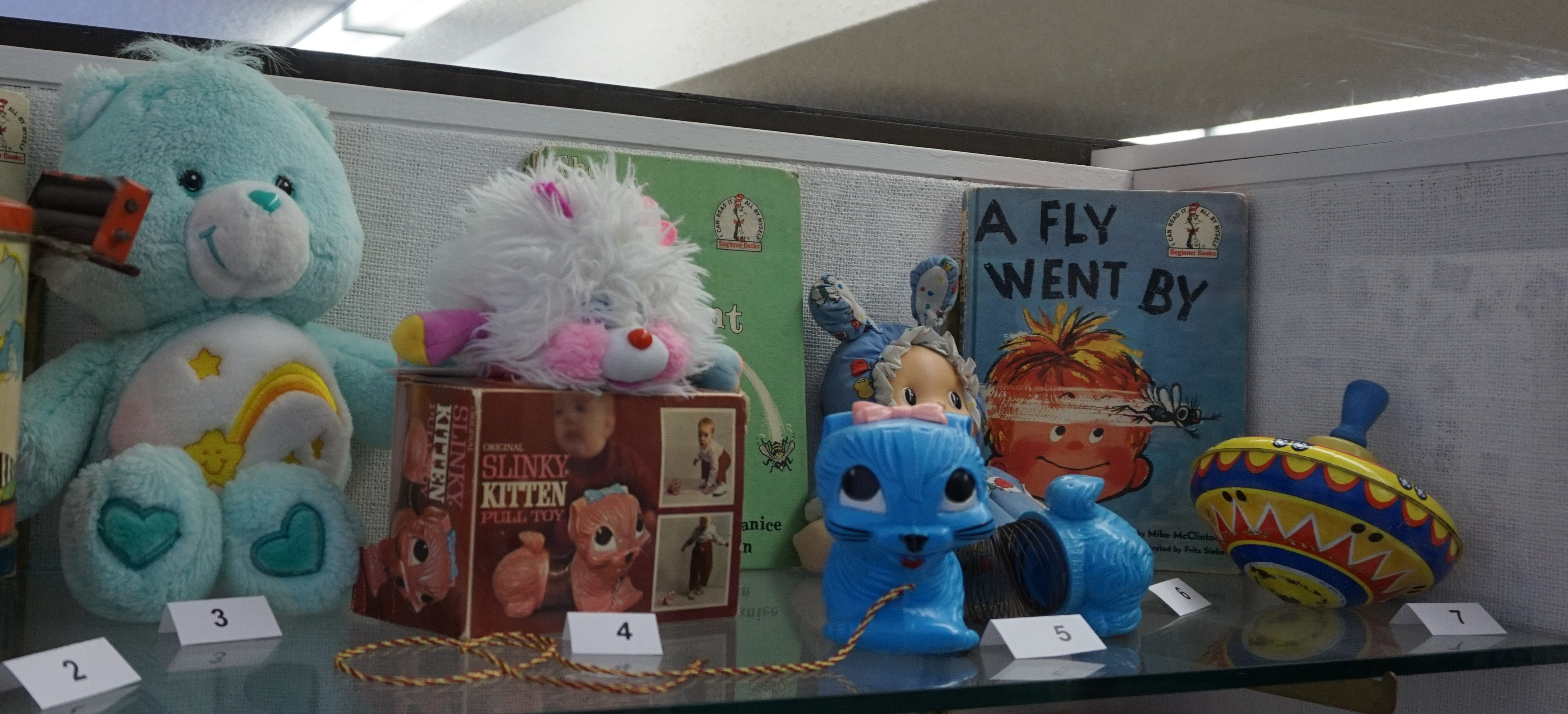 Have you seen this candy before? Lucky Elephant Pink Candy Popcorn is a Canadian candy that has been around since the 1950s! Charleston Chew was created in 1922, named after the Charleston, a popular early-20th century dance. Red Hots Candy were made in the 1930’s under the name “Cinnamon Imperials.” What’s your favorite candy?These are electronic games. The Einstein toy was made by Castle Toys in 1979. It’s a memory game! How does this toy compare to the electronic toys of today?The doll on the left is an Eaton Beauty Doll. Over its 100-year history, the Eaton Beauty Dolls have been treasured by children and collectors! Every year, a different doll was released. Do these dolls look like the ones you play with? Behind the Jack-in-a-Box, you can see some Dr.Seussbooks, which I’m sure you still read today! These are an old pair ofDominion Bob Skates, which are made to help kids learn how to skate. Have you seen these before? Skating is still a fun activity that has been done for many generations!Sports are an important part of the community then and now! This is the Bat Boy’s jacket from the Kronau baseball team in 1946. Look at that Slinky Kitten! She is an example of a “pull toy,” which means it is intended to be pulled behind you, almost like you are walking a dog. Can you think of any new versions of pull toys?What board games do you like to play? This game is called Chinese Checkers and is played with marbles which sit on top of the little holes you see in the board. This game is still popular today!Have you ever played Pinball? This is a vintage handheld pinball game. Much different than playing Pinball on the computer!These are Red Rose Tea Ornaments, made by a company called Wade Pottery. In 1967, Red Rose used to have these little collectibles as prizes in their teas. Have you ever won a prize out of a cereal box?