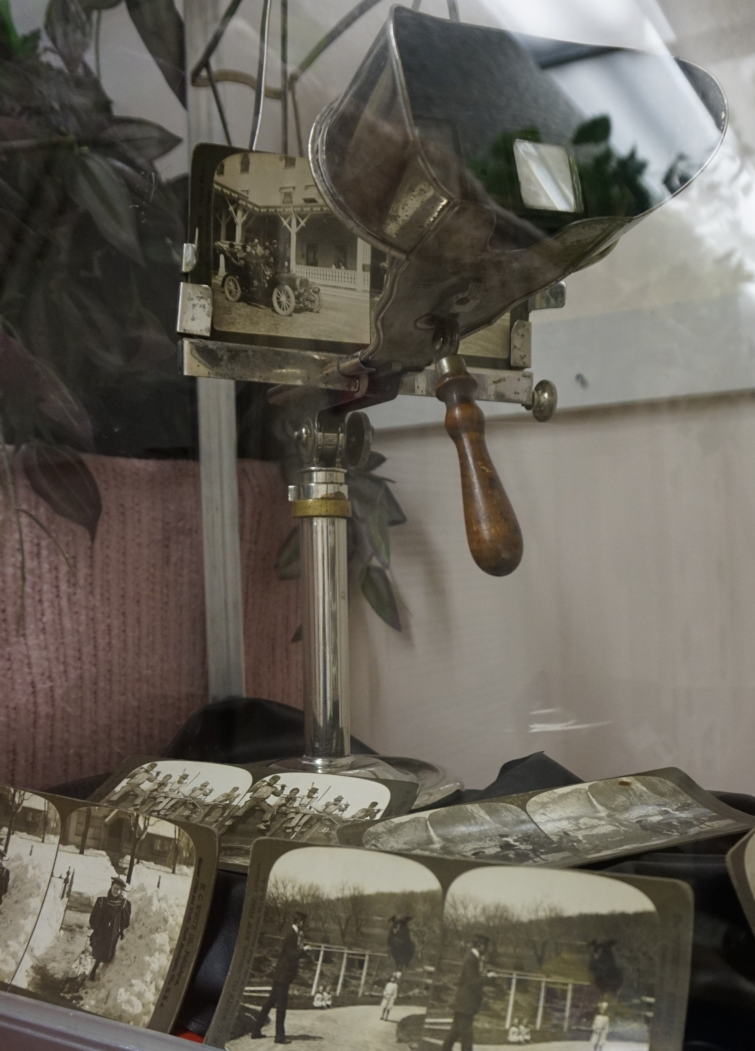 Have you seen one of these before? This is called a Stereoscope, and it was used to make pictures look 3-D! The pictures you see at the bottom were placed in front of the eyepiece, where people would look through. This stereoscope is from 1867! Wow!