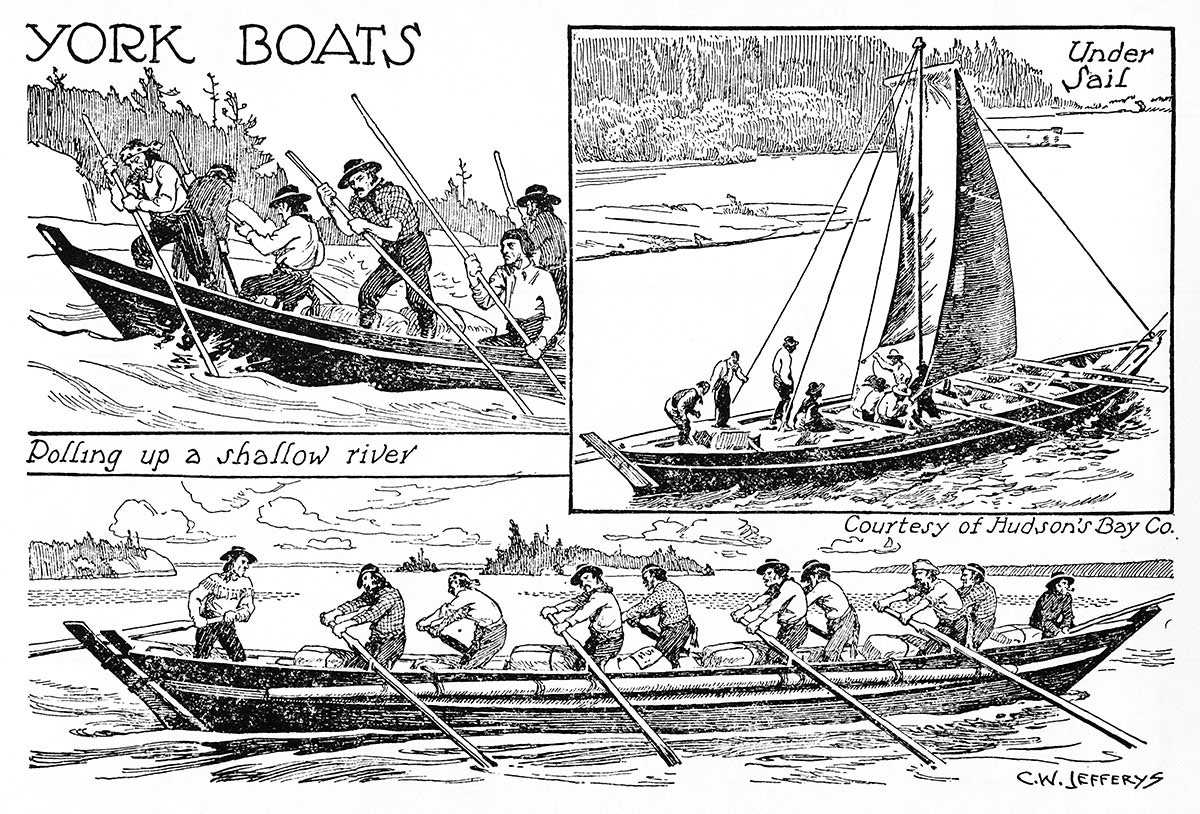 In 1749, the Métis people proudly built the first official York boat. It became the main form of water transportation. The transition from canoe to the York was fueled by the boat’s remarkable ability to carry heavy loads. With a capacity of up to 6,000 pounds the York boat required a crew of only six to eight people. In the Michif language, this boat was known as the “canot du nord.”